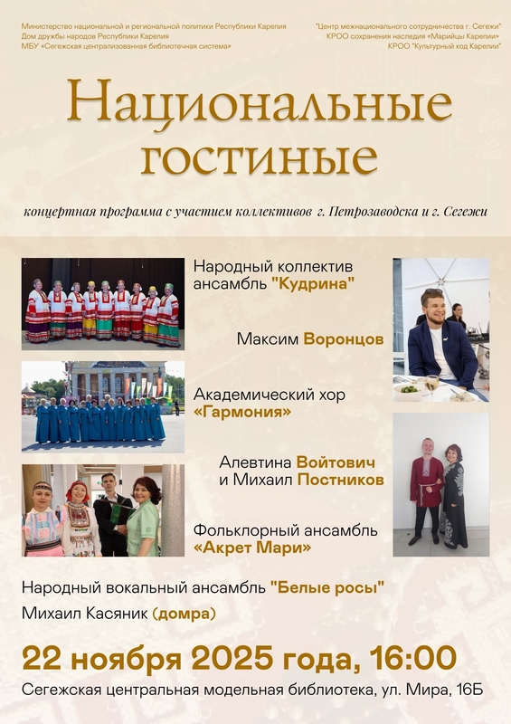 Сегежская центральная модельная библиотека приглашает всех желающих посетить фестиваль духовной и народной музыки. Начало 15 ноября 2025 года в 15-00 в лекционном зале библиотеки. Вход свободный.