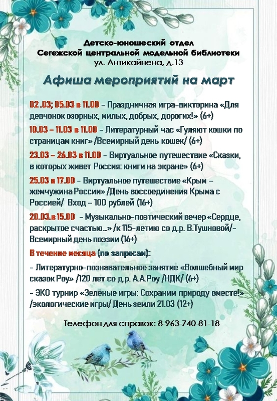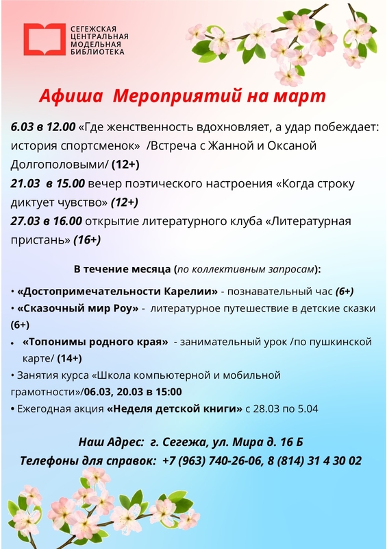 01/03/2026 Афиша мероприятий детско-юношеского отдела Сегежской центральной модельной библиотеки на март