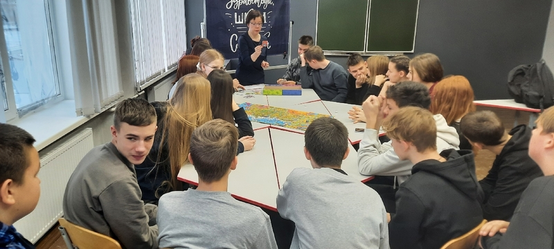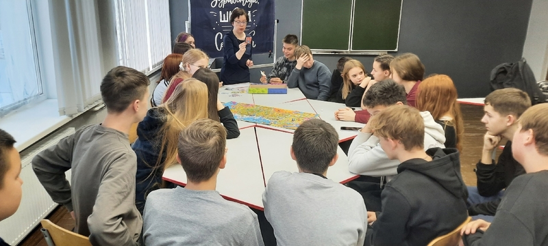 Разделившись на команды игроки с помощью кубиков и фишек побывали в разных федеральных округах и городах нашей огромной страны.